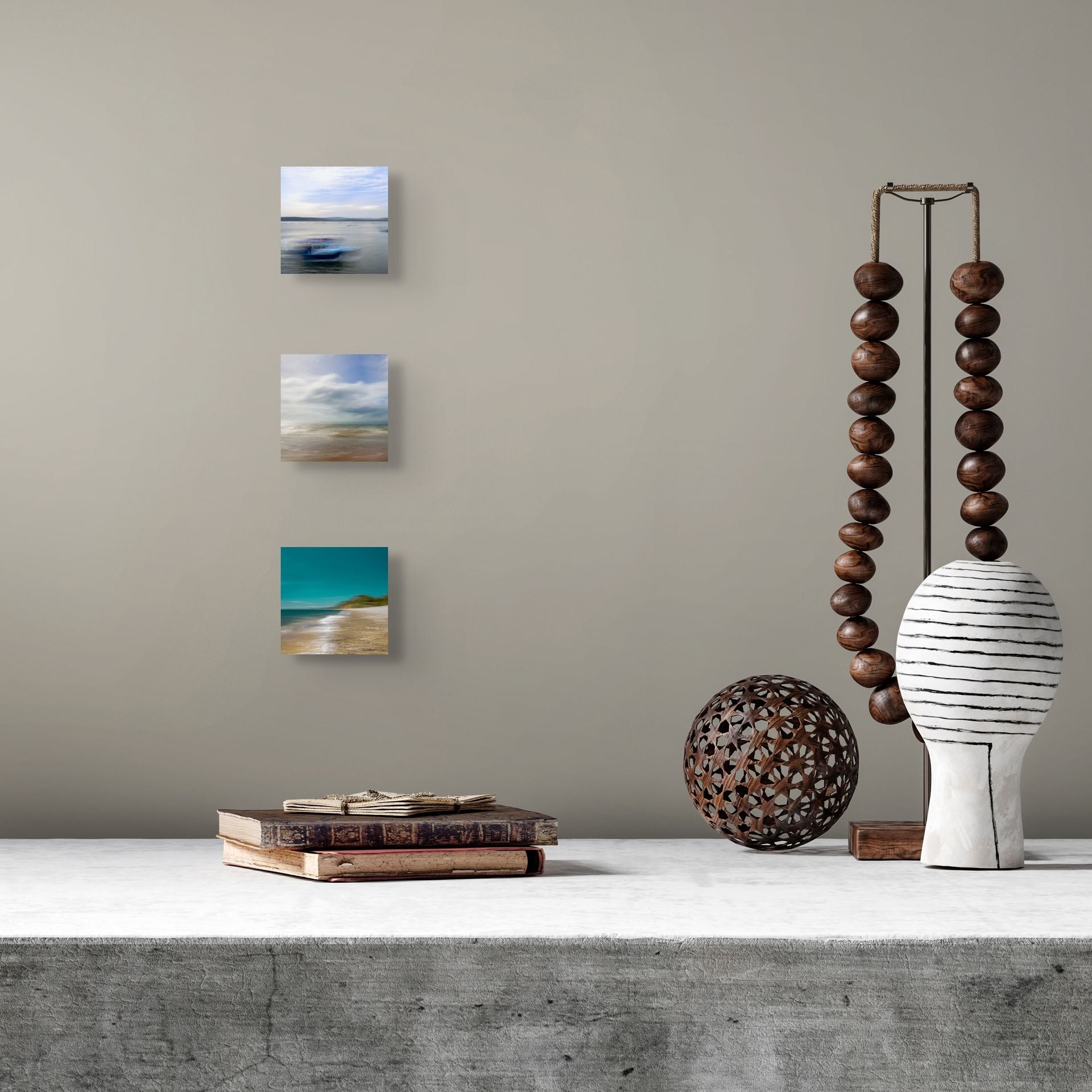 Hints of vibrant blue and gentle ripples echo the quiet energy of coastal travel—boats gliding across the water, their forms melting into the atmosphere like fleeting impressions of a journey unfolding. The interplay of sky and sea, accentuated by delicate streaks of motion, evokes both serenity and excitement—an invitation to embrace the rhythm of the tides.